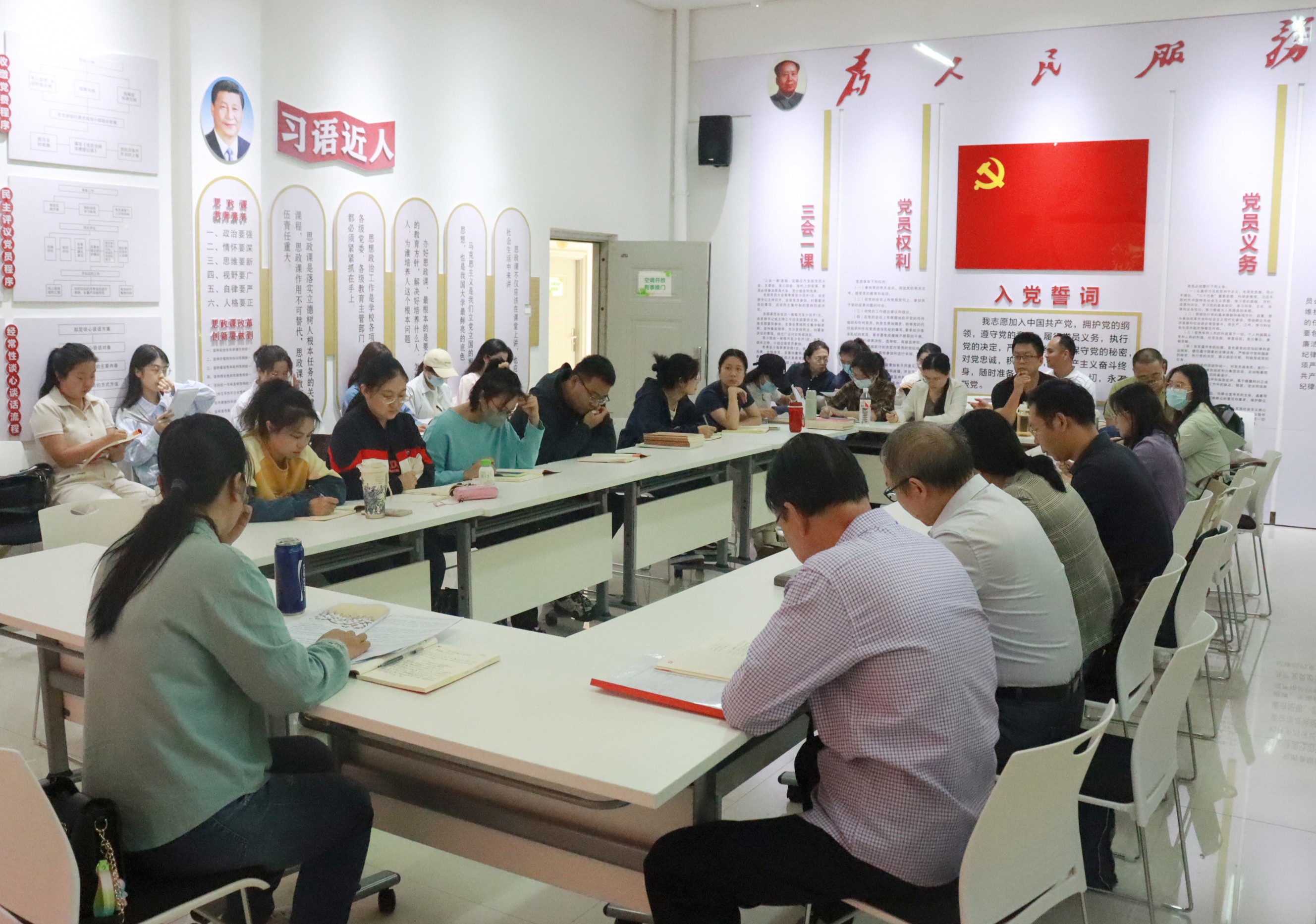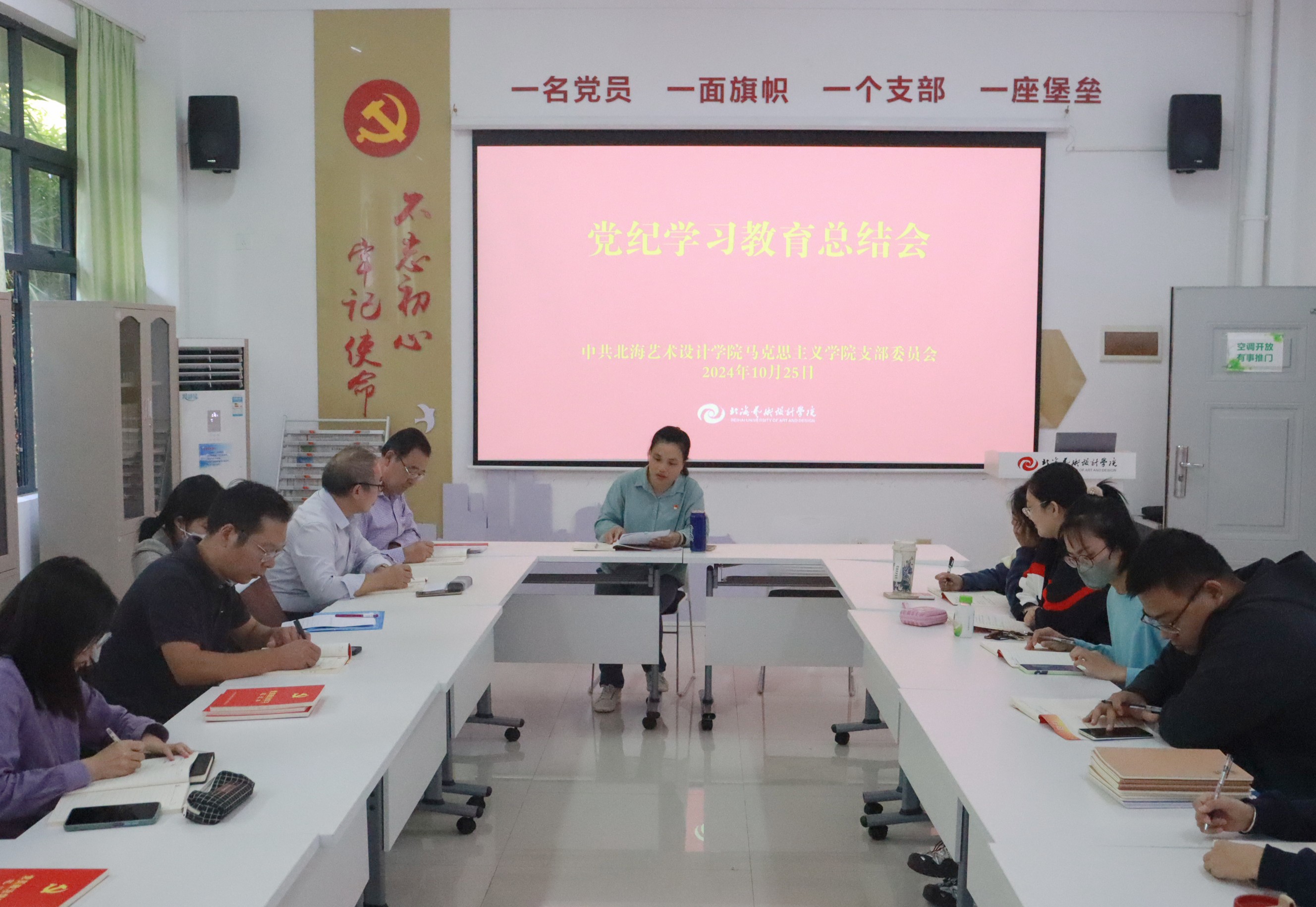 10月25日下午15:00,马克思主义学院党支部召开党纪学习教育总结会,全体党员参加。