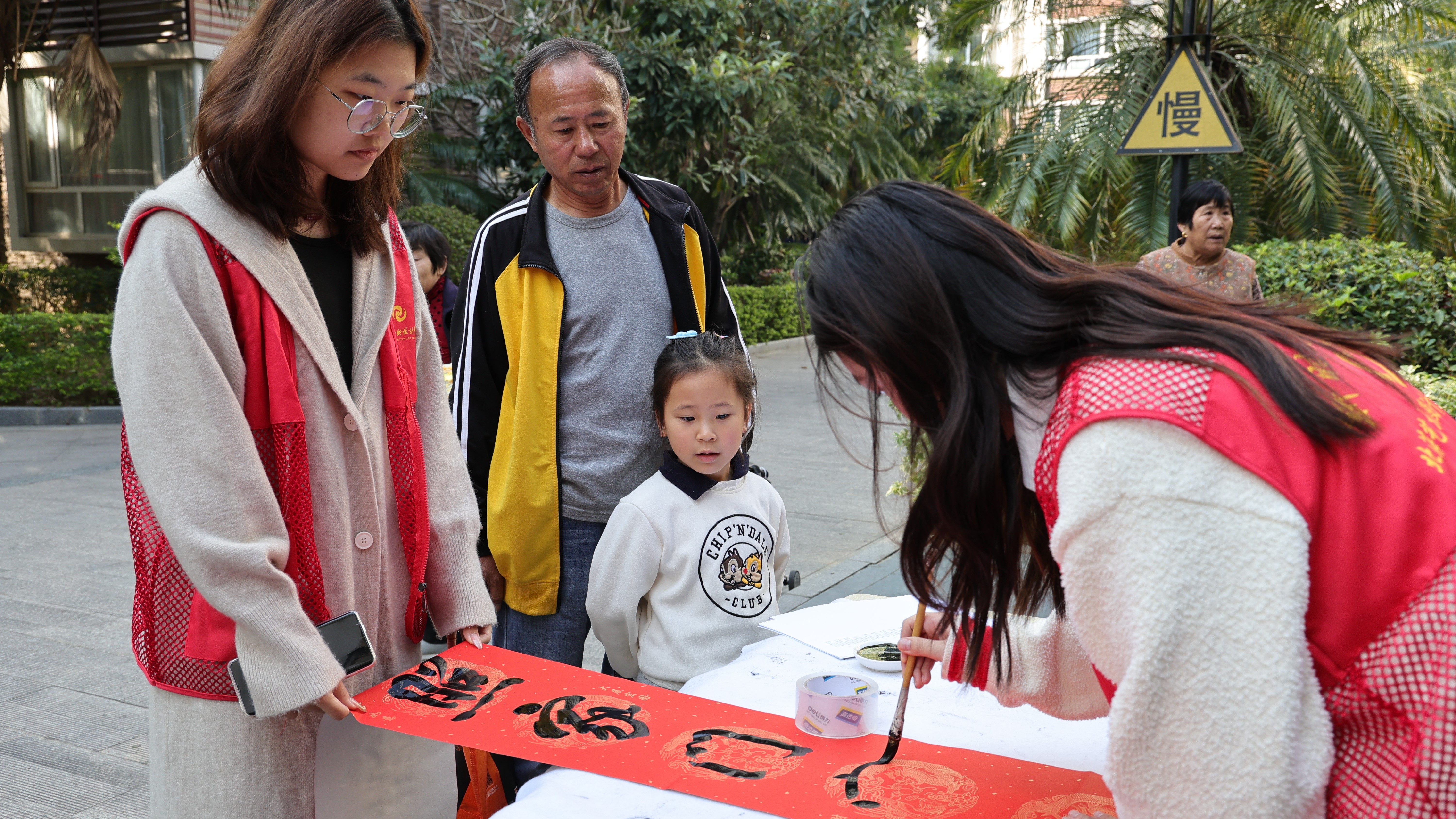 此次活动也得到了我校多位领导的关注,校党委副书记彭仁、美术学院执行院长龚为莅临现场指导活动。书法学院党支部书记喻广林、书法学院党支部副书记左云飞、书法学院学工办主任兼分团委书记李家琪、美术学院学生第一支部副书记许荣军、书法学院教研室副主任张天赋、书法学院教师江威龙、书法学院教师石建玲,参与此次活动,共同为社区居民送来新春祝福。
