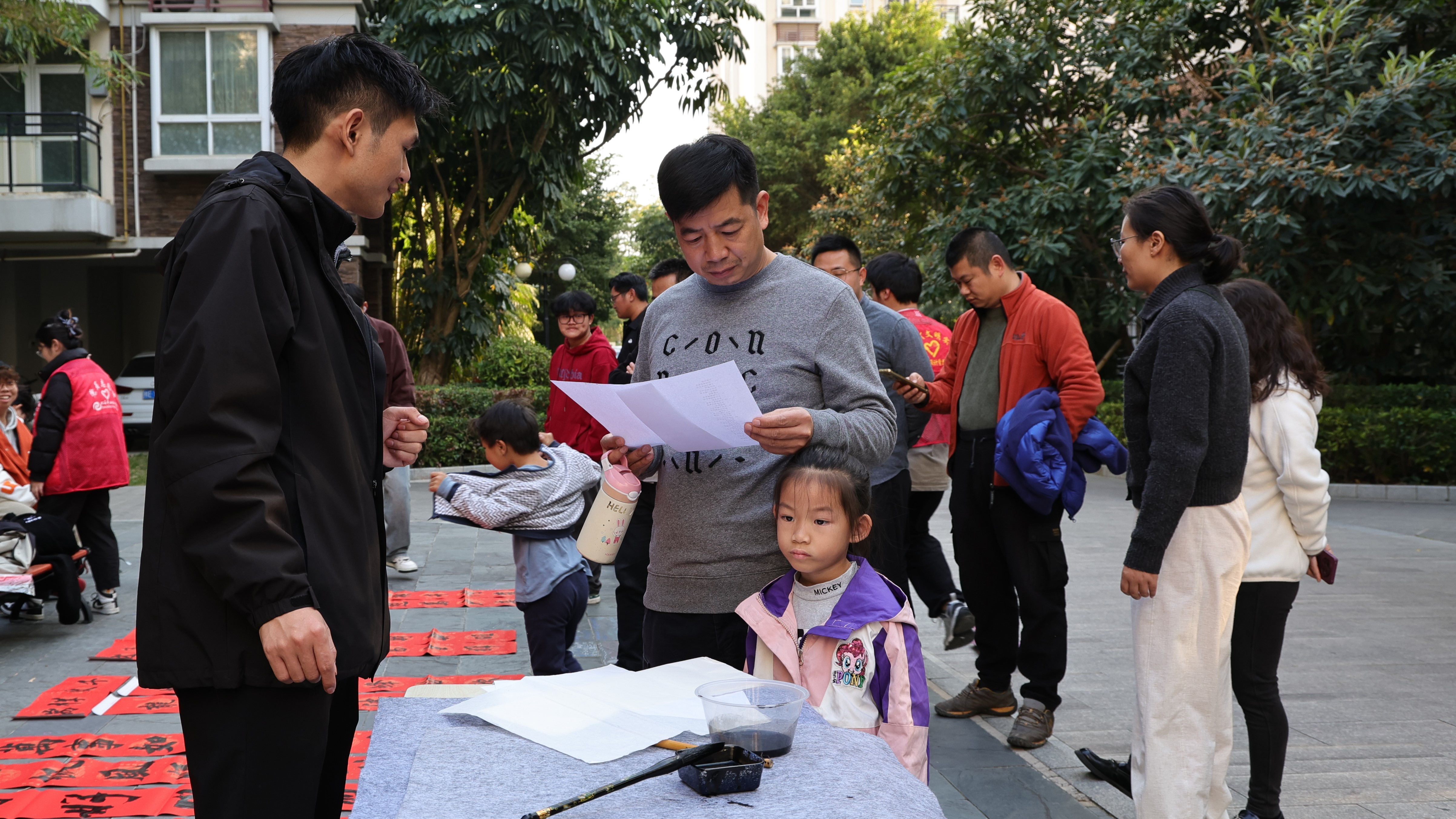 活动现场,气氛温馨又热烈,师生们热情洋溢,挥毫泼墨,随着笔锋的运转,一幅幅字体灵动、苍劲有力的新春对联与“福”字跃然纸上。居民们精心挑选内容心仪的春联,美好祝愿凝聚于纸张之间,感受着生活的美好与希望。