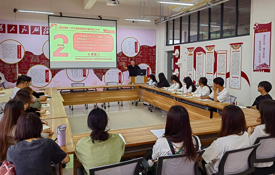 最后,黄锦书记作总结发言,要求大家应以高度的思想自觉、政治自觉与行动自觉在学习和工作中去贯彻落实好党的二十大精神,并希望老师们能紧紧围绕落实立德树人根本任务,培养德智体美劳全面发展的社会主义建设者和接班人,希望同学们能刻苦学习,自律自强,以自己的真才实学为建设“中国式现代化”贡献自己的一份力。