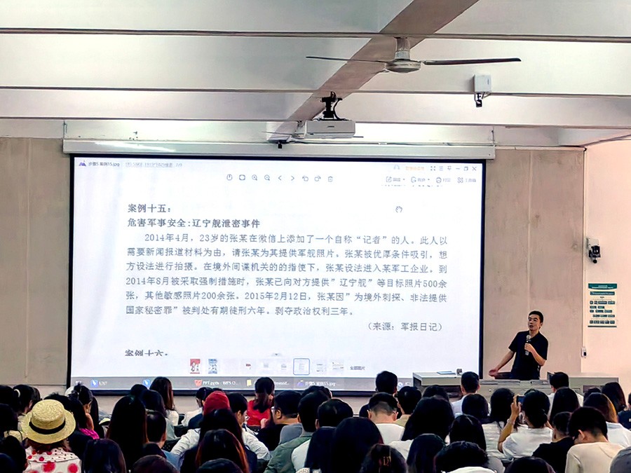首先开展的是总体国家安全观学习,学习方式为集中学习与个人自学相结合,在集中学习环节,由学院组织教职工在“广西校园安全”微信公众号进行学习,党总支书记黄锦领学,黄锦书记向大家介绍了“广西校园安全”微信公众号的内容和功能,包括其下设安全防范、舆情上报、校安工作三大版块的特点和使用方法。接下来讲解了全民国家安全教育日的设立背景、现实意义以及公民个人在维护国家安全方面的义务。重点为大家宣讲了几个国家安全教育警示案例,包括在个别少数民族学生在高校从事宗教极端活动,危害军事安全的军舰泄密事件等。