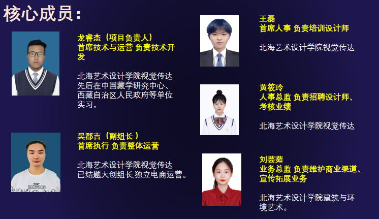 项目团队指导老师卢雯芝、张筠梓均是来自我校设计艺术学院的具有多年教学和指导经验的老师。团队还受到了小江瓷第五代非遗传承人叶尚风的指导。项目团队成员由4位来自设计艺术学院产品设计专业和1位视觉传达专业本生组成。