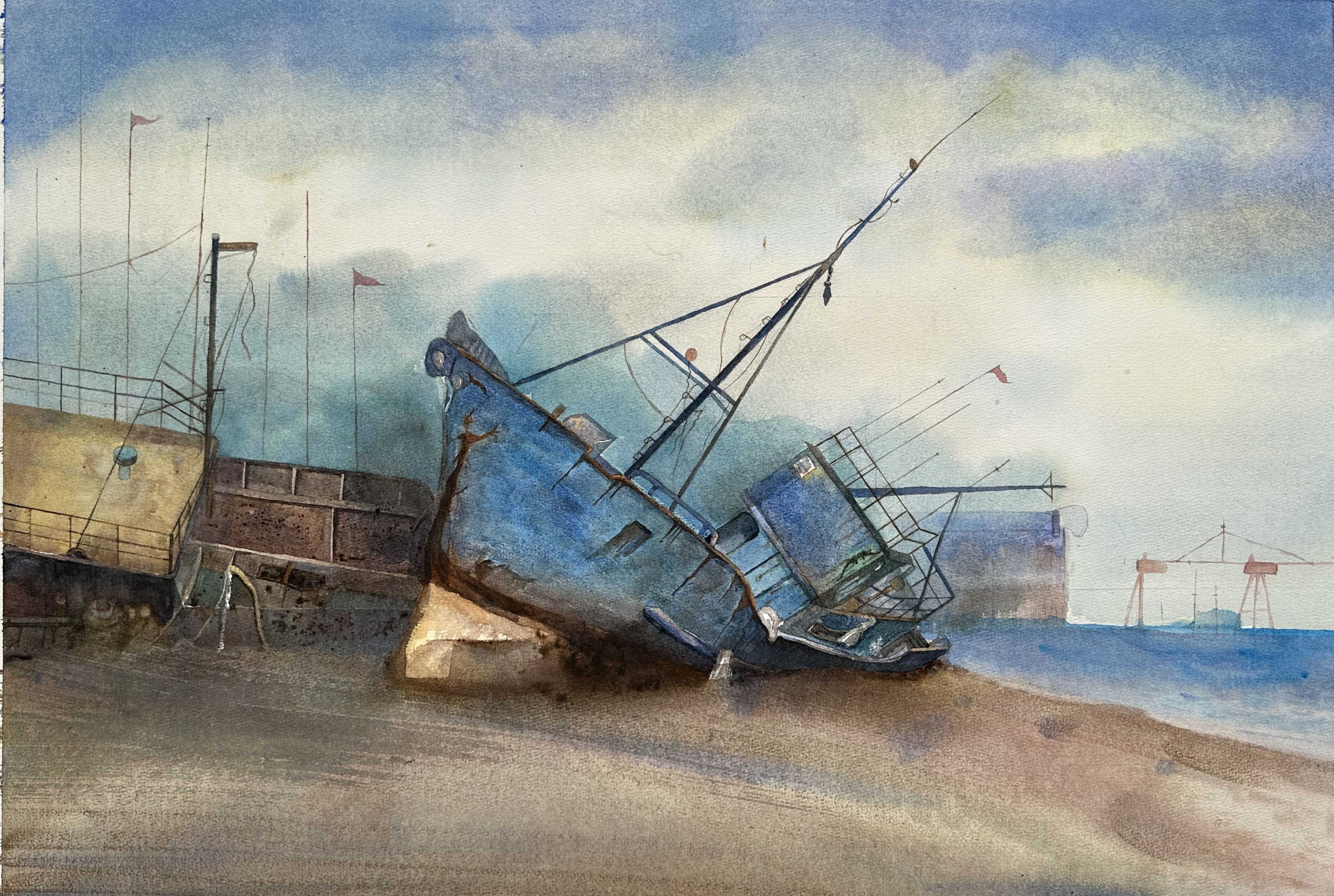 罗永在《搁浅的船》 49cm×72 cm  2023年 纸本水彩