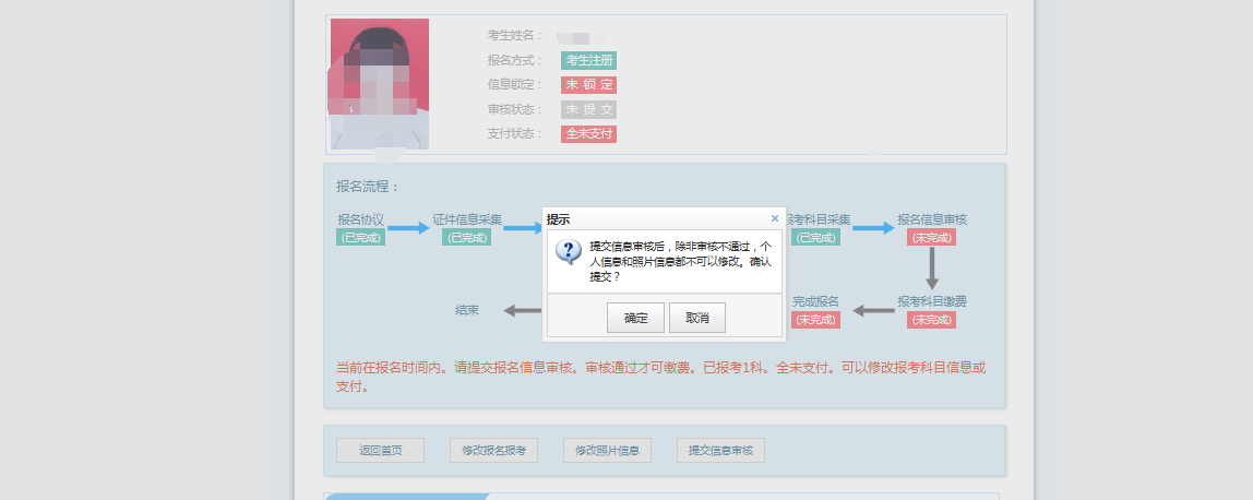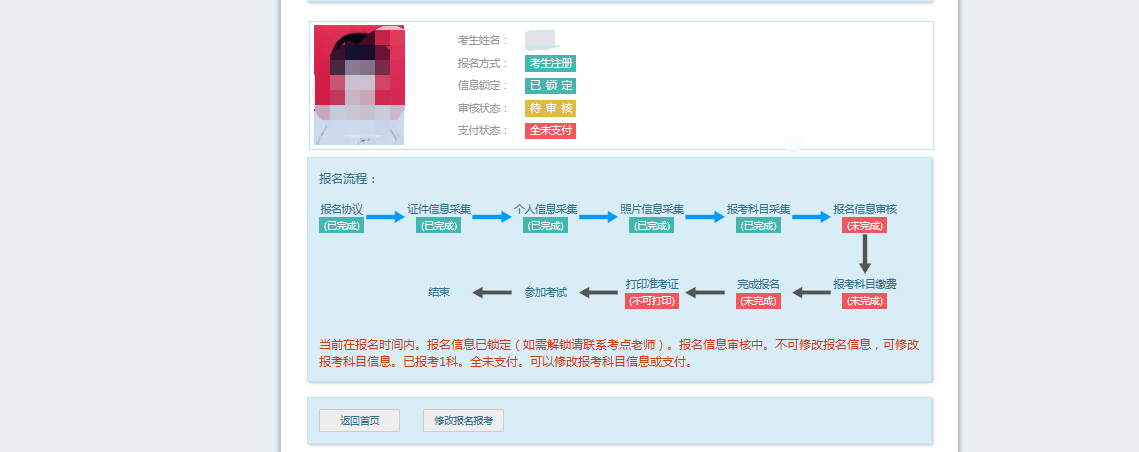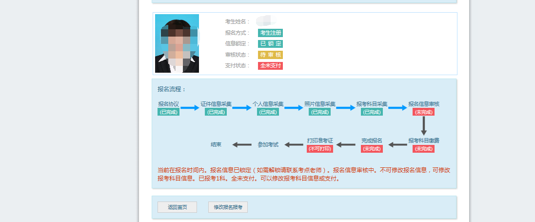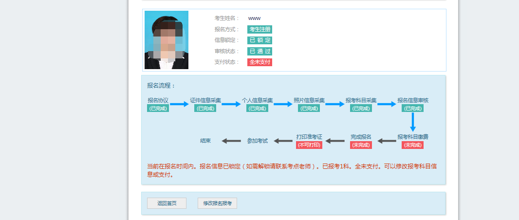 2.支付成功后报名流程完成,考生不能修改个人信息、科目信息或退考退费。