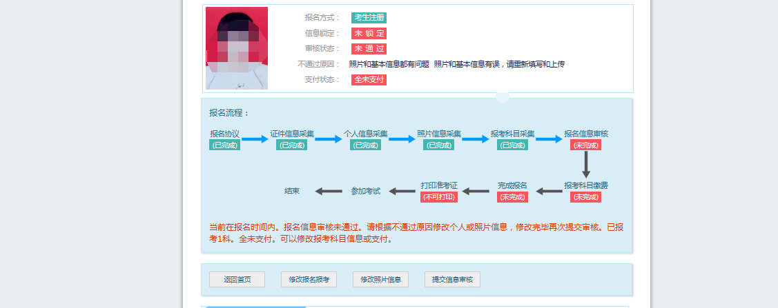 若考点设置审核信息不通过,则考生可根据考点填写的不通过原因进行修改,重新提交审核。