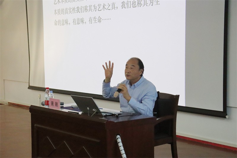 周刚教授以何为创作、何为生活引向导入讲座内容。他指出,生活是人在生命路途中劳作与分享的活动,要学会把日常生活转化为艺术作品。他表示,当一个艺术家有了明确目标,就会有创作目标。他还通过播放作品,阐明了艺术就绘画而言是艺术家创造的隐含美学特征作品的要义。
