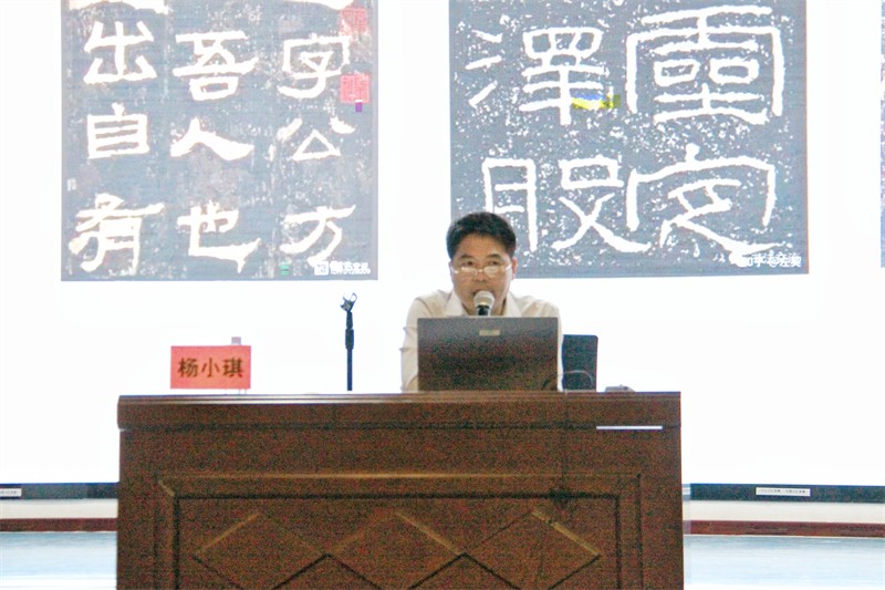 讲座伊始,杨小琪院长围绕隶书的起源与发展脉络展开系统梳理,纠正隶书的传统认知偏差。他指出,隶书源于篆书的快写与草写实践,早在战国时期便已萌芽,其发展历程可明确划分为四个阶段:战国至西汉末期为形成期,东汉至魏晋南北朝为成熟期,隋唐至宋元明为衰微期,清代金石学兴起后,隶书艺术迎来第二次发展高峰,并逐步形成至今盛行的艺术格局。