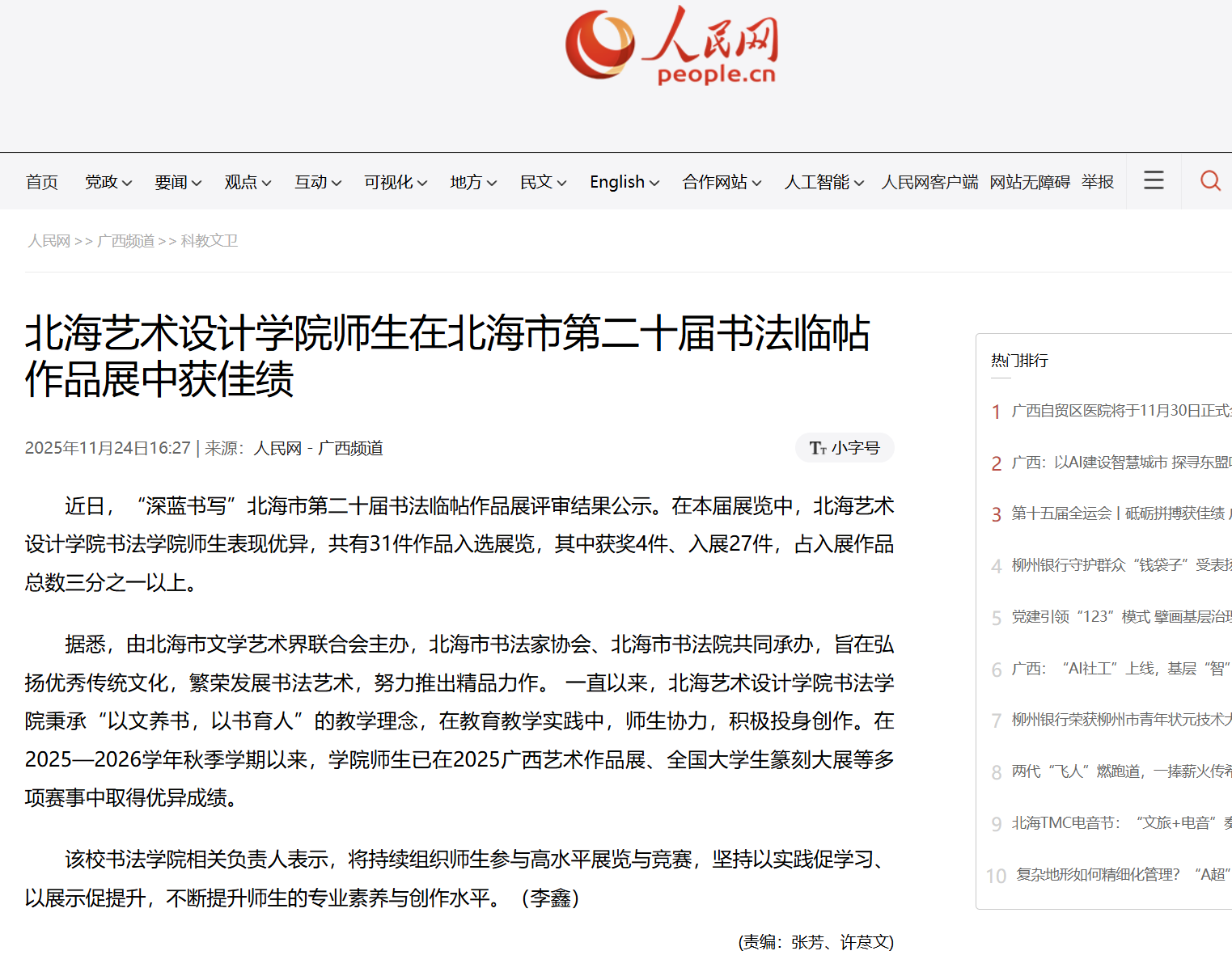 人民网:北海艺术设计学院师生在北海市第二十届书法临帖作品展中获佳绩
