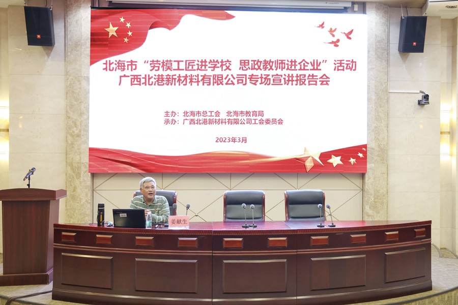 为大力弘扬劳模精神、劳动精神、工匠精神,充分发挥劳模工匠榜样示范作用和思政教师的专业优势,3月16日,由北海市总工会北海市教育局主办的“劳模工匠进学校 思政教师进企业”宣讲报告会活动走进北港永不锈书院。我院院长姜献生教授应邀到企业进行现场宣讲来自北港新材料各条战线的劳模工匠先进代表及一线职工代表80余人到场聆听。
