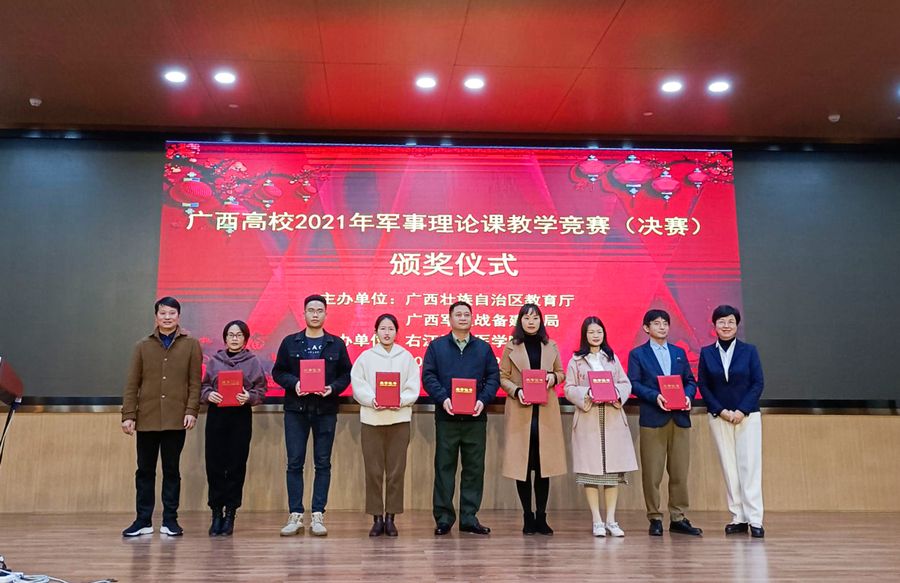 12月8日至9日,2021年广西高校军事理论课教师教学竞赛(决赛)在右江民族医学院举行。本次竞赛由广西壮族自治区教育厅,广西军区战备建设局联合举办,全区共有191名高校选手参加初赛,经过激烈角逐,最终评选出25名选手进入现场决赛。我校马克思主义学院老师刘贻敏在决赛中表现优异,荣获二等奖,充分展示了我校青年教师良好的精神面貌。