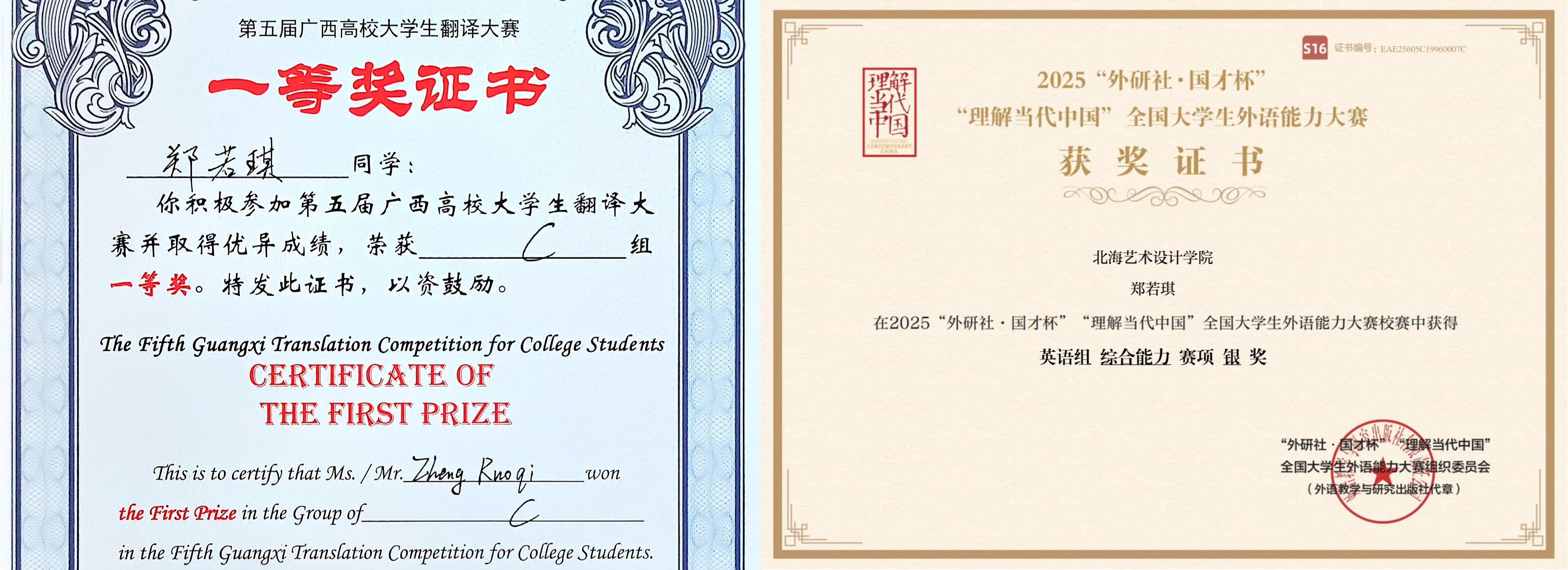 2025年12月,获第五届广西高校大学生翻译大赛一等奖;