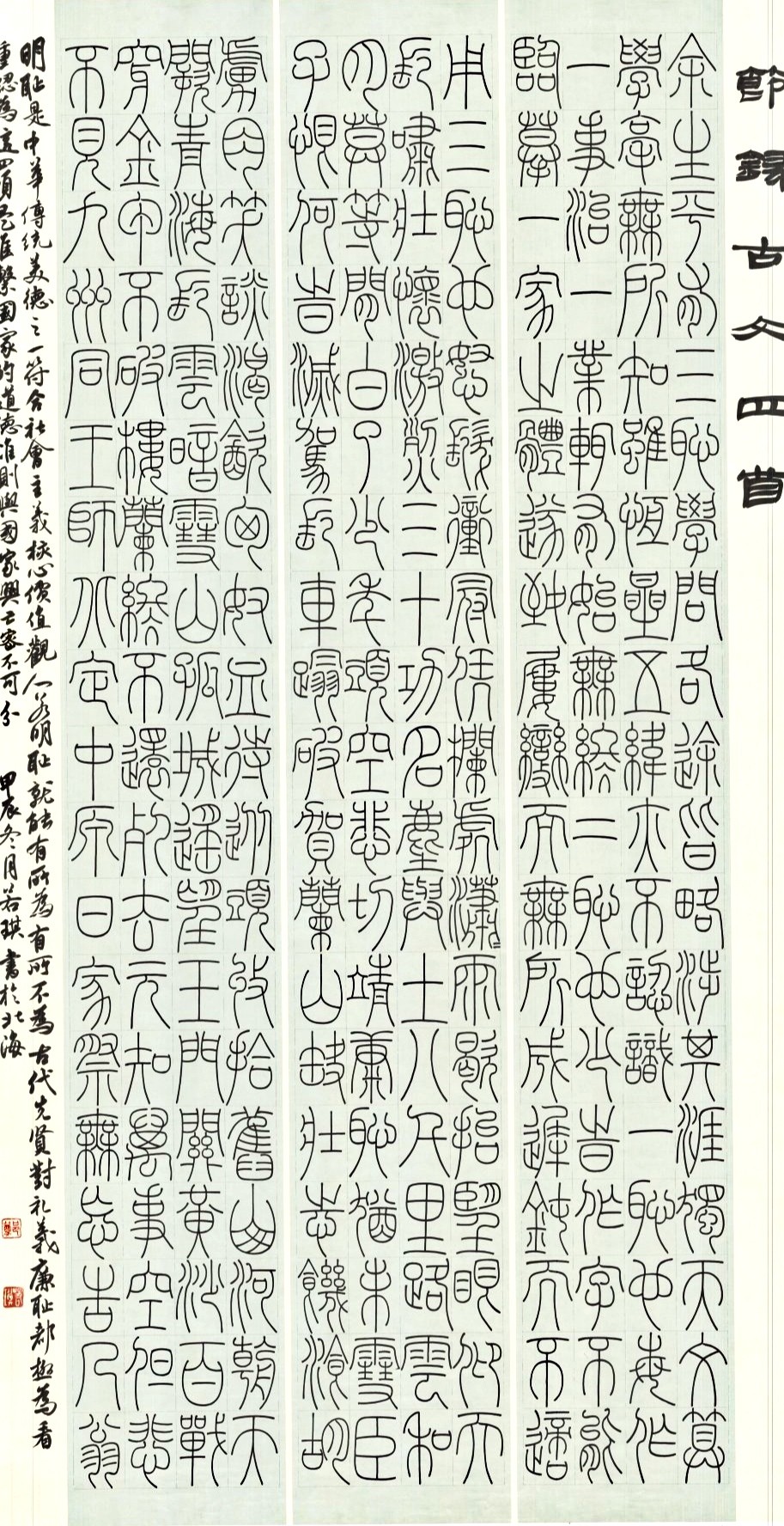 在专业方面,郑若琪深受李阳冰篆书、米芾行书风格熏陶,始终以经典碑帖为根基,在临摹与创作中不断突破。她坚信传承不是照搬,而是在古法中寻根、在实践中创新。研习时,摸索出“先求形似,再追神似”的方法,从笔法、结构等基础细节入手打磨,逐字精临以突破瓶颈,慢慢领悟古代书家的艺术气韵与创作节奏,力求作品形神兼备。