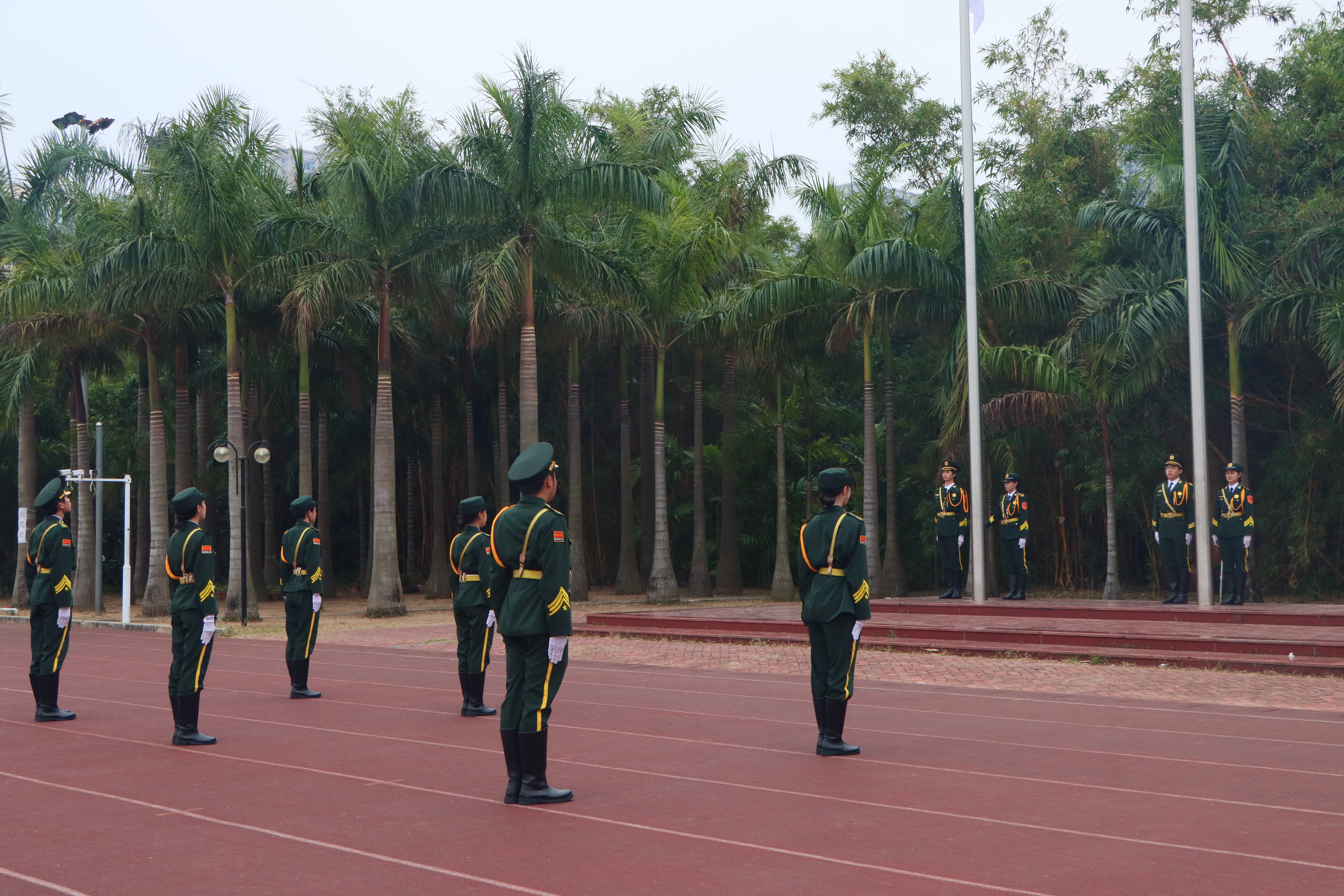 清晨,暖阳轻洒校园。国旗护卫队队员身着礼服手擎国旗,迈着铿锵正步从操场东侧走向升旗台,步伐整齐、脚步声铿锵。在场师生驻足而立,目光追随着耀眼的国旗。