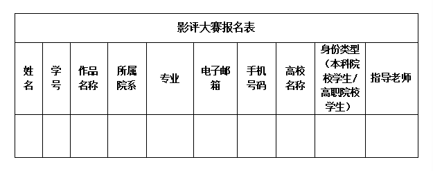 (一)参赛者可从各个院校公告自行下载参赛报名表(附件)并填写,并将电子版作品及报名表一起发送至各校自设的投稿邮箱;影评大赛不接收纸质版作品,所有参赛作品将以投稿邮箱为准。