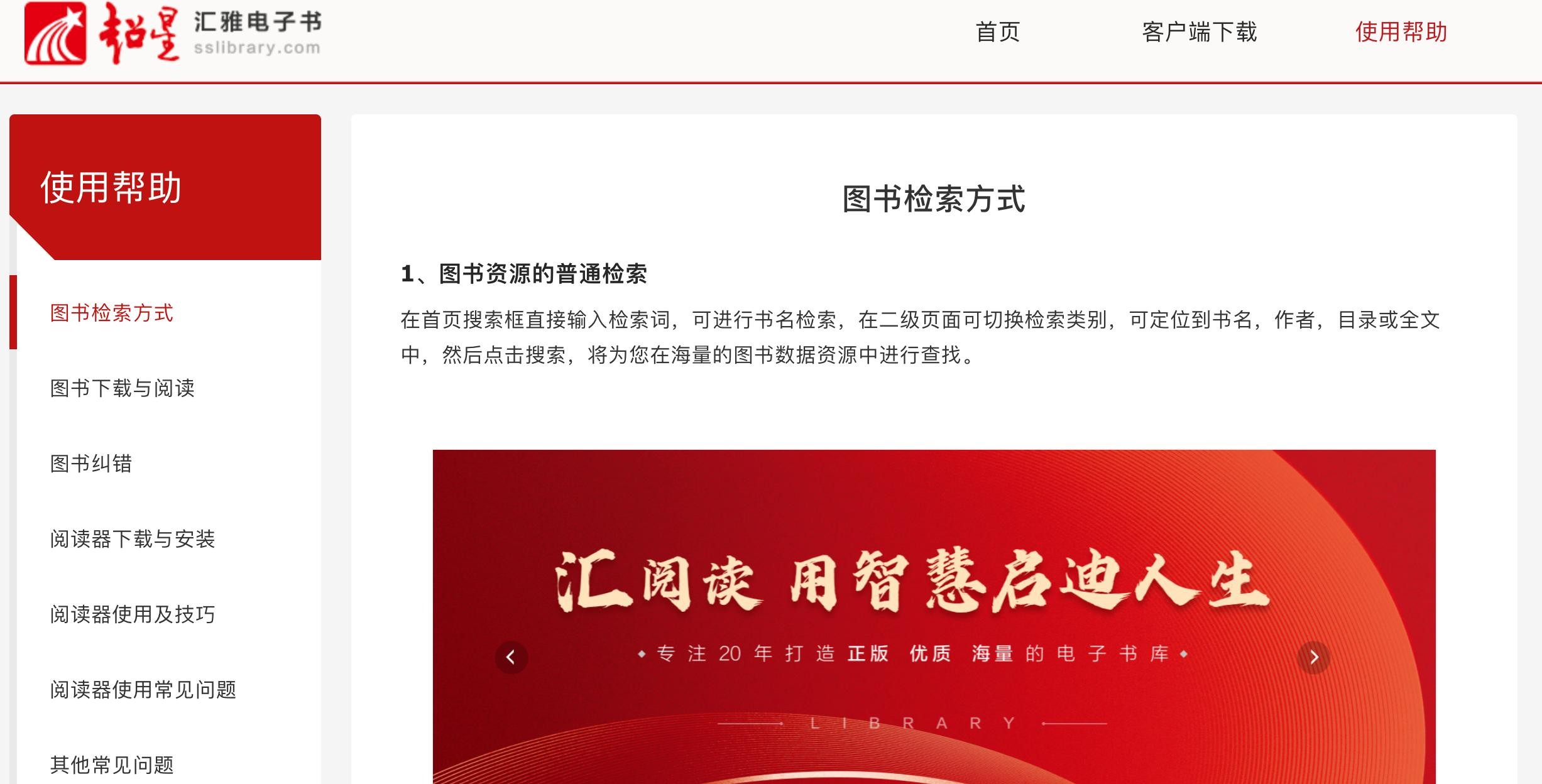 解决方法:您在使用超星汇雅电子书时,在右上角会有使用帮助,您可以在这里进行问题反馈,我们有客服人员会对您的问题进行解答,或者添加QQ:2074424464进行咨询,会有专人解答。