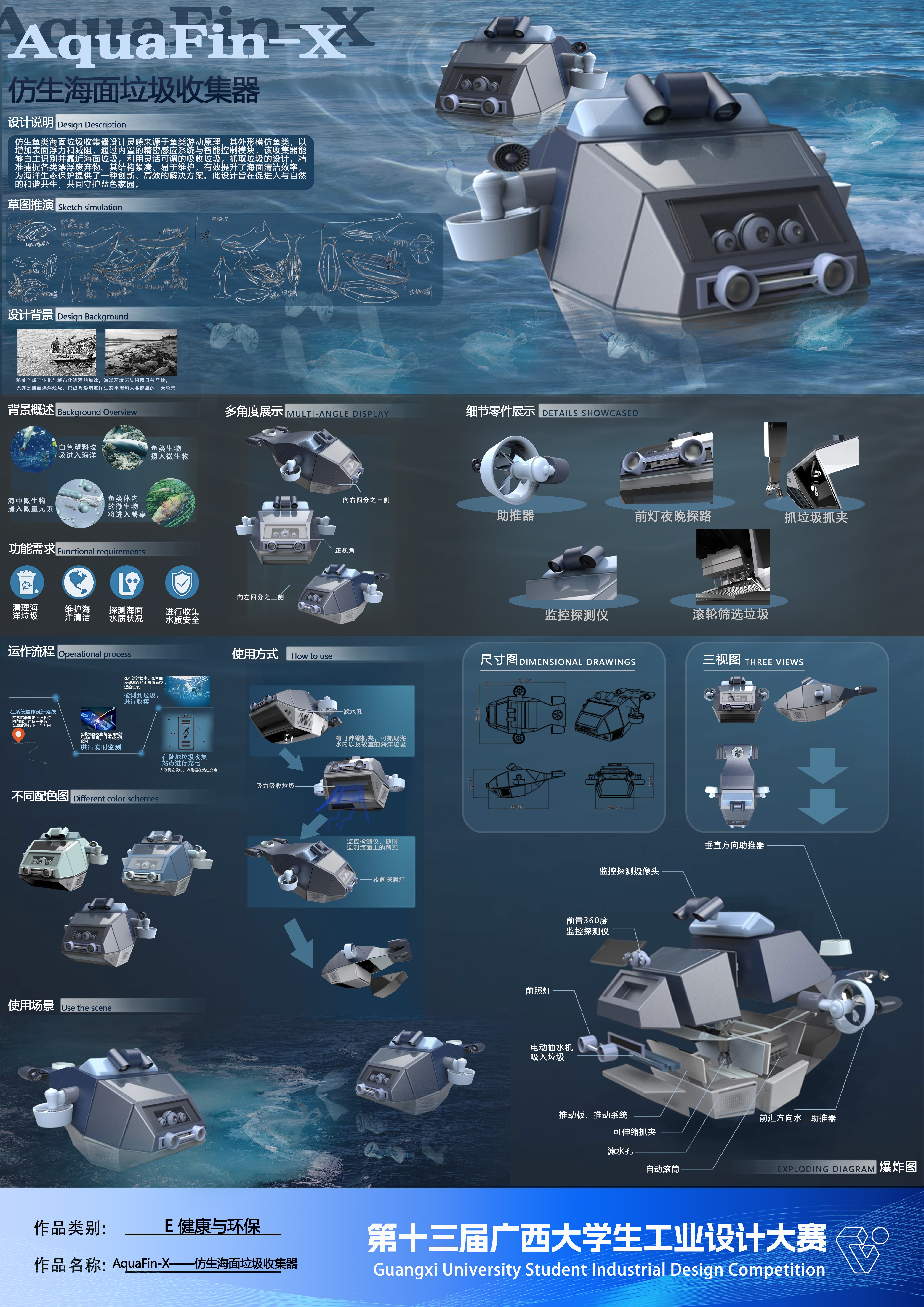 作品名称:AquaFin-X——仿生海面垃圾收集器   作者:睢晓宇、黄雨晴、李佳