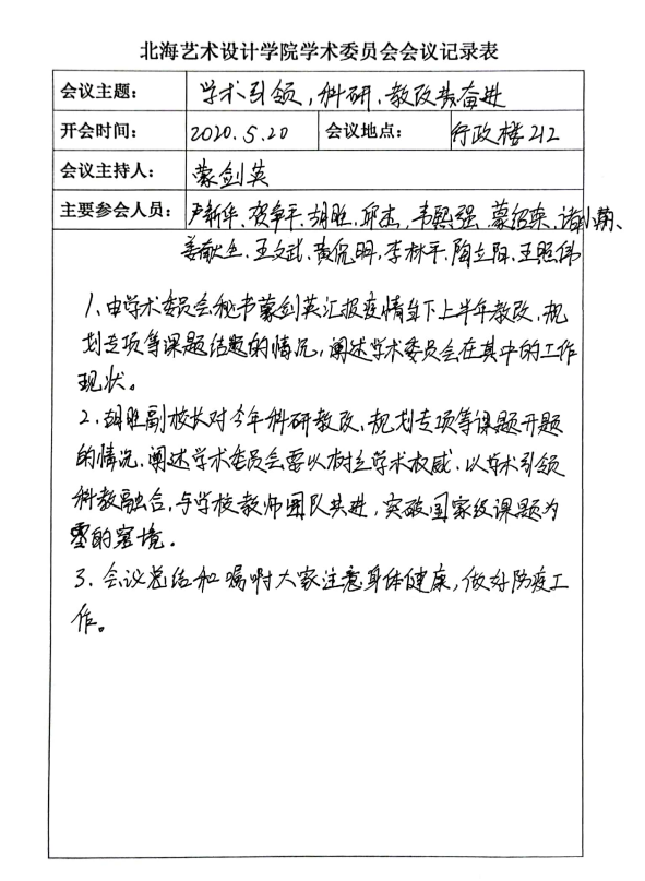 2020年5月20日,北海艺术设计学院学术委员会行政楼212召开上半年工作汇报会议。校长卢新华等校领导出席会议,此次会议由学术委员会秘书蒙剑英主持。