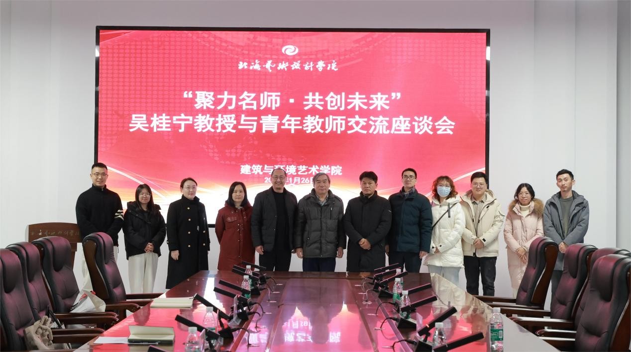 北海艺术设计学院建筑与环境艺术学院于2024年1月26日16:30在艺德楼805举行了“聚力名师·共创未来”吴桂宁教授与青年教师交流座谈会。座谈会由建筑与环境艺术学院副院长张春东主持。