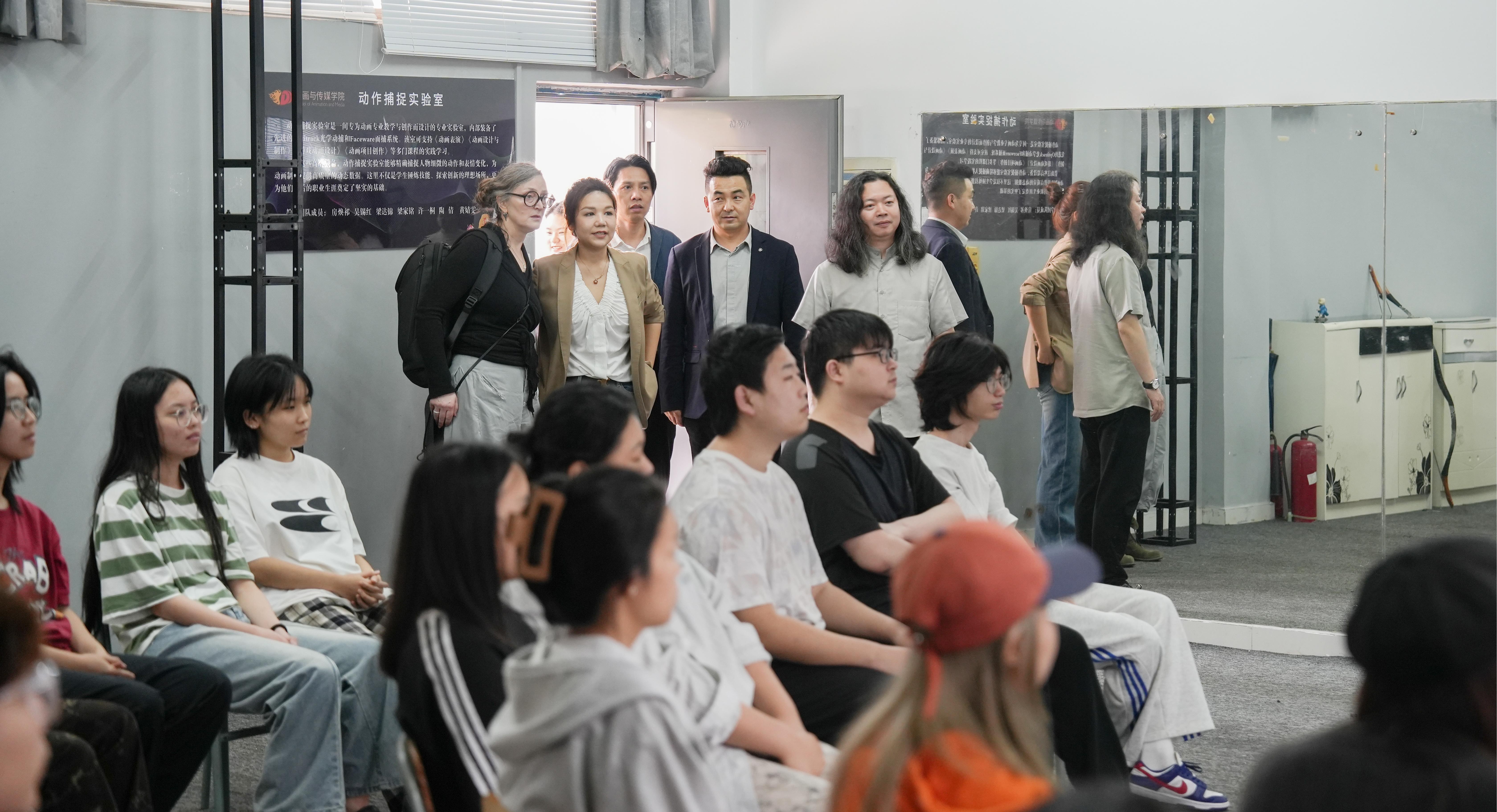 在胡胜校长、孙永辉院长、张帆书记及教学团队陪同下,穆雷院长深度参观了动画、数字媒体艺术综合实验室群,她重点考察了动捕表演室,观看了学生实时动作捕捉课程,并对虚拟实验室的摄影技术与渲染实验室的作品成果表示赞赏。孙院长向穆雷教授详细介绍了设备运行与学生项目进展。在王钢工作室,孙院长对学院正在创作中《勇敢的阿牛哥》动画项目进行讲解,穆雷院长对学生的创意实践能力给予高度评价。
