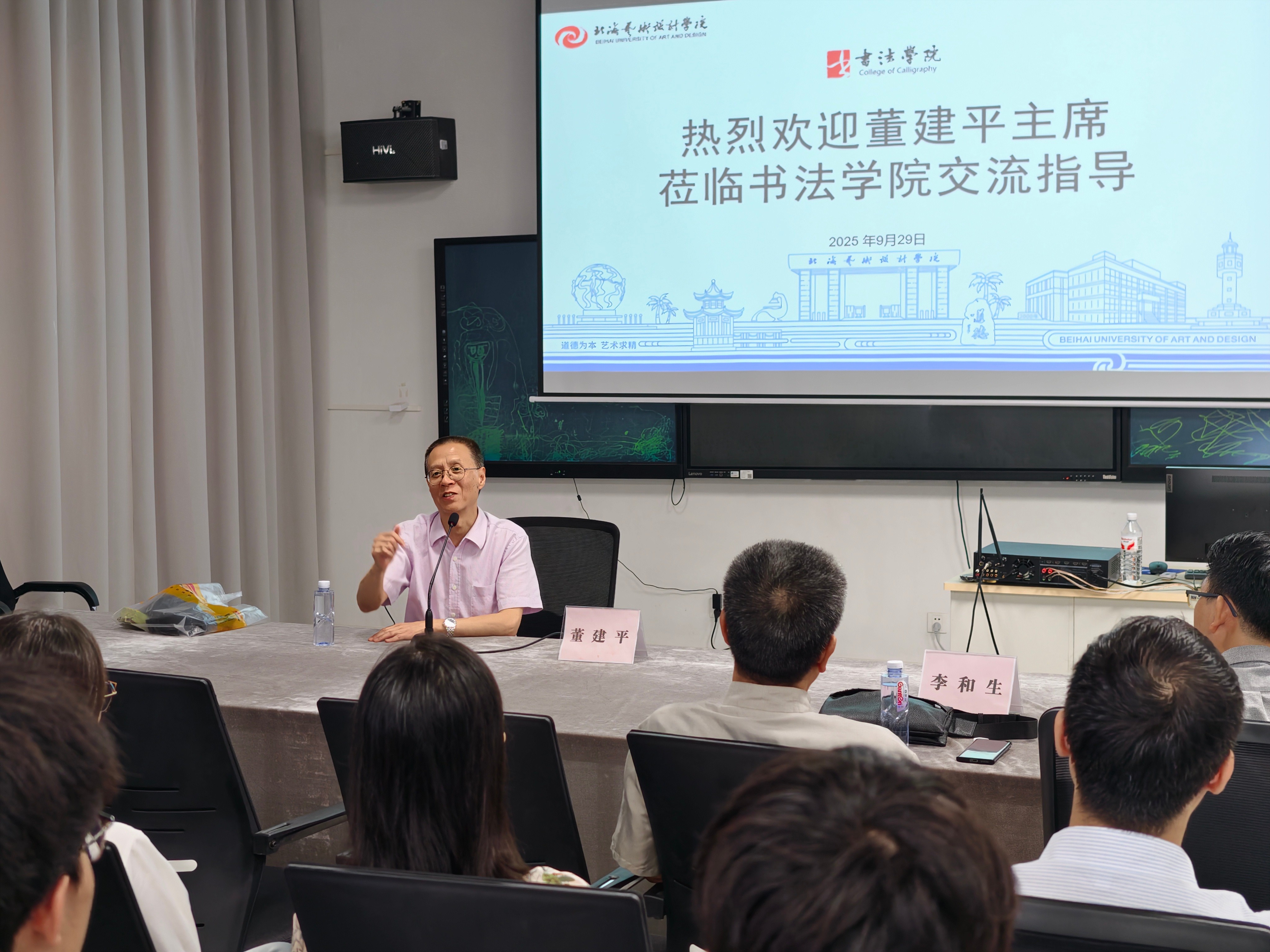 弘扬中华优秀传统文化,培育书法艺术新生力量9月29日,我院特邀著名书法家、西安书学院名誉院长、西安市书法家协会副主席董建平与西安市书法家协会第五届副主席、西安美术学院客座教授李和生莅临学院,共同开展“守正创新·书法传承”系列交流活动。活动由学院常务副院长苏乃从主持,涵盖主题座谈会与现场笔会两大环节。
