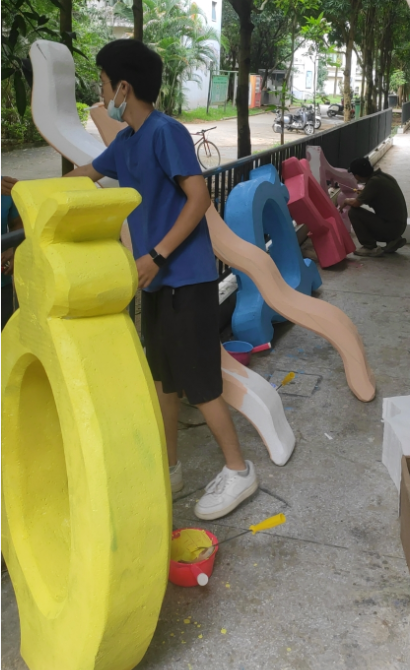 我院参加此次公共艺术周的作品名为《北部湾仲夏夜》,由雕塑教研室教师张泰莹、黄寿宁、欧安佳、杨凯、林盼鑫、金凯婧、许珍珍、覃媛媛等教师设计以及制作,共历时半个月。作品为泡沫切割成形为主,以墙漆调色上色为辅。以广西北部湾仲夏渔闲之余人们多彩的生活为背景,以不同形状及大小的海鱼为创作符号依据,对其进行提炼与简化,加以重新空间的布局与创作作品尺寸:4mx0.8mx2m。作品表现“人”与“海的和谐共生的主旋律。
