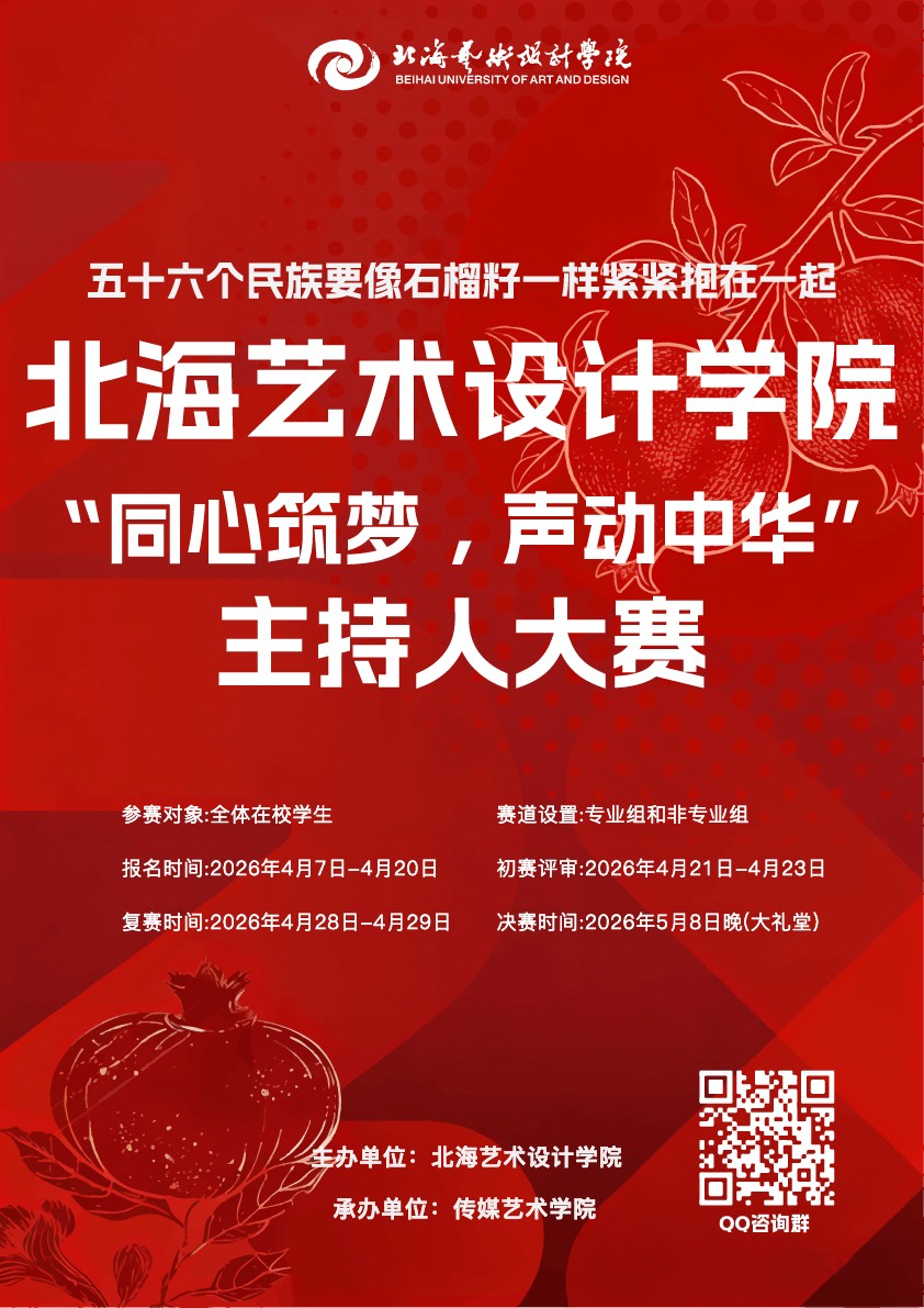 时光履迹,声动芳华。在这充满朝气与奋进的时节,一场汇聚青春与热爱、彰显语言之美的盛会正式启幕——北海艺术设计学院2026年“同心筑梦,声动中华”主持人大赛,邀你共赴热爱,共赏锋芒!