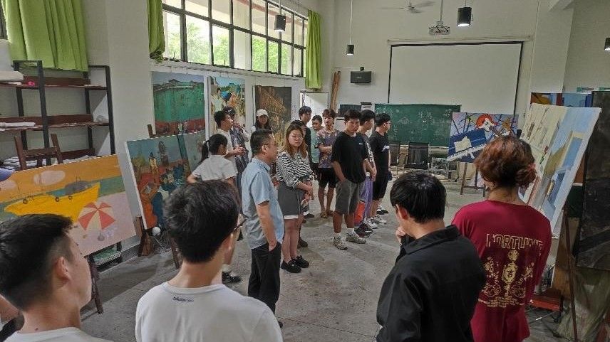 2022年6月9日,2021-2022年度第二学期末,美术学院组织绘画专业19级同学于西校区7栋教学区进行了创作课程的教学成果汇看。本次汇看评审小组由美术学院副院长龚为、美术学院综合办主任肖玺、美术学院综合办副主任陈建江、美术学院实验室主任袁志伟、绘画教研室副主任张湘中以及多位任课教师组成。各位老师对学生的作品进行了集体观摩并提出指导建议,对于即将离校的学生给予了相关事宜的嘱咐和未来学习生活上的鼓励。(张湘中 摄)