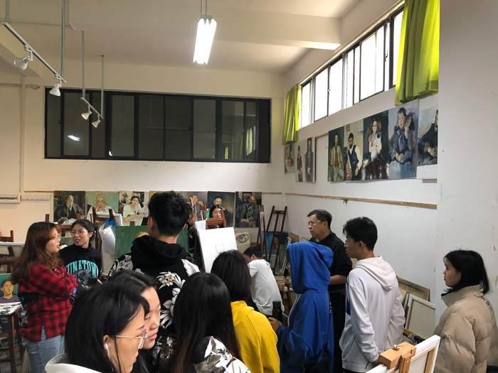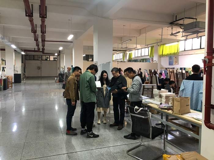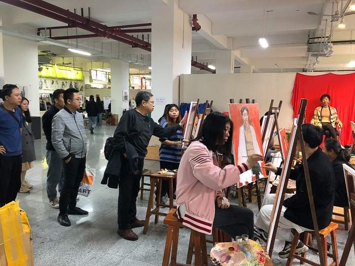 之后,美术学院常务副院长龚为、学工办主任袁志伟及美术学院绘画专业教师陪同计宇教授参观了绘画18级教学区,并进行教学指导。
