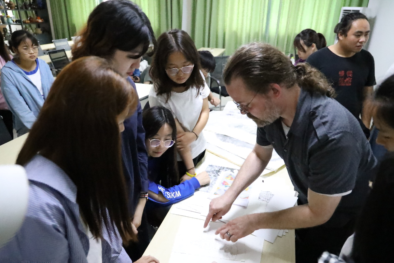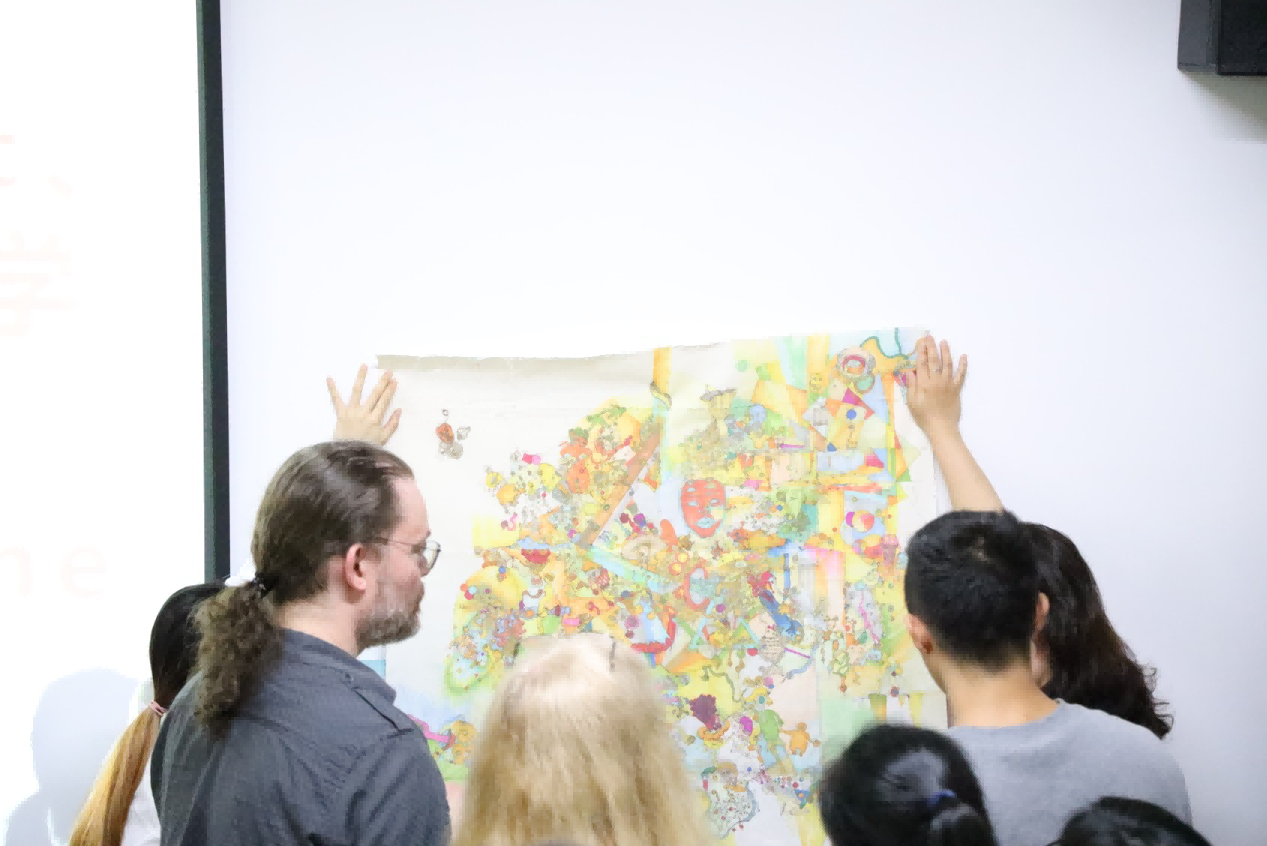 最后,学生们拿出平时最优秀的作品请艺术家与教授观看及指导。艺术家们对每位同学的作品都细心指导点评。针对学生作品中的不足予以指出,对于优秀的地方则鼓励其继续进行的提升。