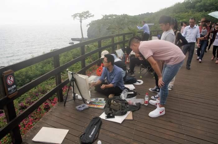 鳄鱼山公园是由火山喷发的熔岩所形成的天然景观,湛蓝的海水,赤红的火山岩礁石,再加上彰显岛屿风格的木头栈道,这一切新鲜的景象给师生们瞬间带来了无限的灵感,全体师生在大自然的鬼斧神工之下开始了对自己作品的构思并开始挥舞画笔。