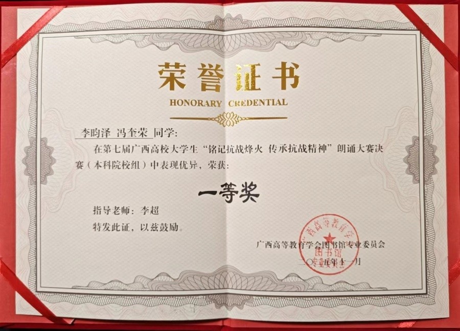11月15日-16日,第七届广西高校大学生“铭记抗战烽火 传承抗战精神”朗诵大赛决赛在南宁师范大学顺利举行。我校传媒艺术学院两名学生李昀泽、冯奎荣代表学校参赛并在众多参赛选手中脱颖而出,荣获本科院校组一等奖。