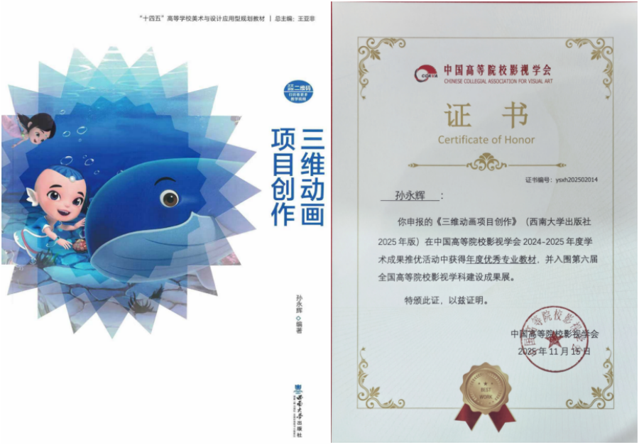我校教师孙永辉编写的《动画项目创作》教材,在本次学术成果推优活动中获评“年度优秀专业教材”,同时入围第六届全国高等院校影视学科建设成果展。该教材紧密对接动画专业教学实践与行业发展需求,内容兼具理论深度与实操指导性,系统梳理动画项目创作全流程要点,为高校动画人才培养提供了优质教学资源。此次双重荣誉的获得,是对教材专业价值与编写质量的认可,也体现了我校在影视动画学科教材建设与教学研究领域的扎实积累。