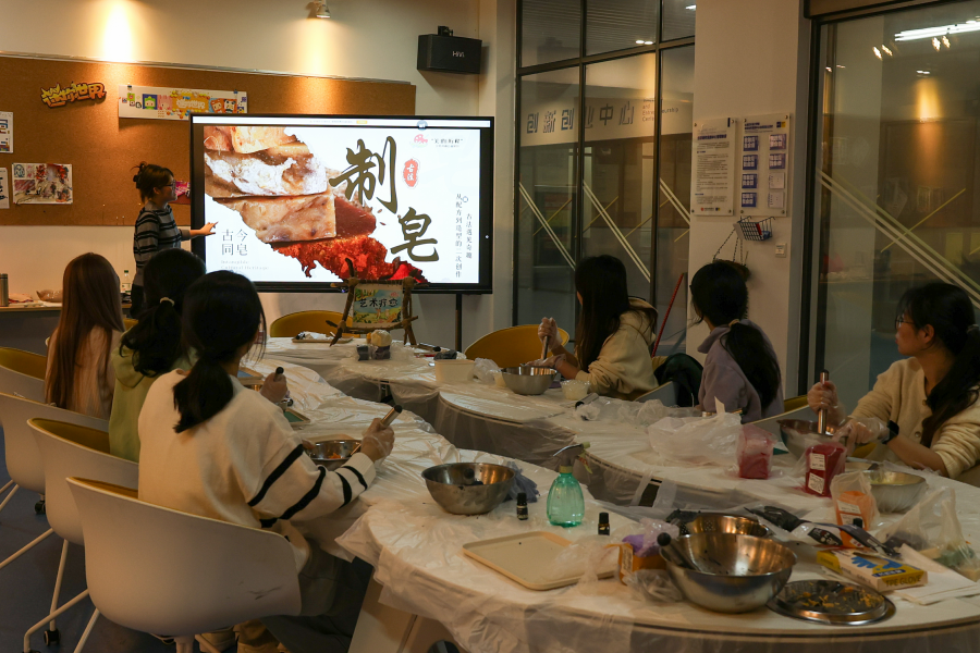 12 月 16 日下午,由我校大学生创新创业训练计划项目“美的历程——艺术疗愈公益项目”团队策划的“古今同皂”非遗古法制皂体验活动,在西校区图书馆负一楼顺利开展。活动创新融合非物质文化遗产传承、手作艺术实践与心理疗愈功能,引导参与者在沉浸式体验中实现文化感知与自我观照的双重收获。