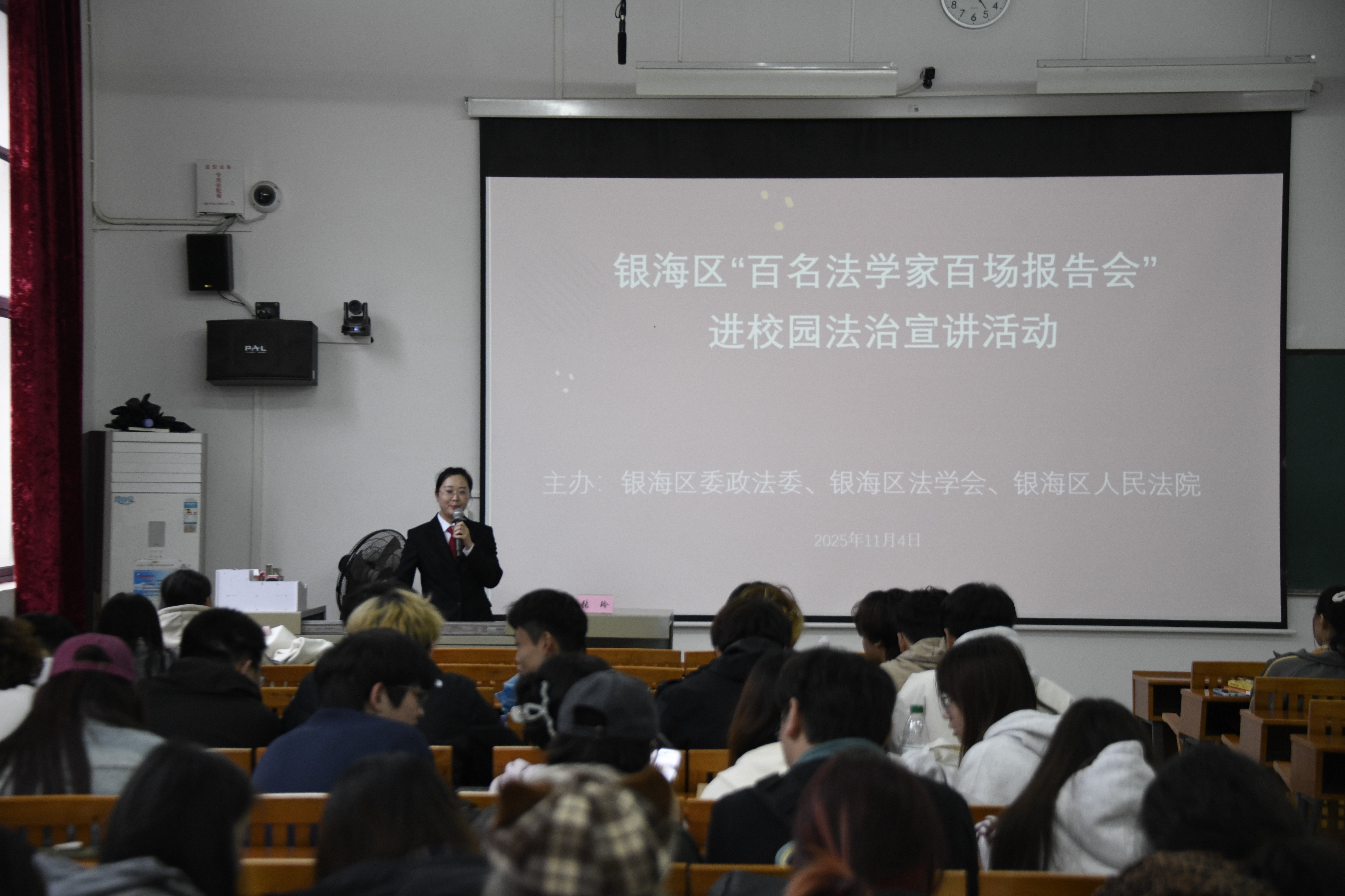 为深入贯彻落实习近平法治思想,扎实推进依法治校、立德树人,在全校范围内营造尊法学法守法用法的浓厚氛围。我校2025年“百名法学家百场报告会”法治宣讲活动在公德楼114教室举办,本次活动特邀北海市银海区人民法院员额法官张玲作专题报告,报告会由学生工作部(处)副处长马啸主持,百余名学生代表参加报告会。